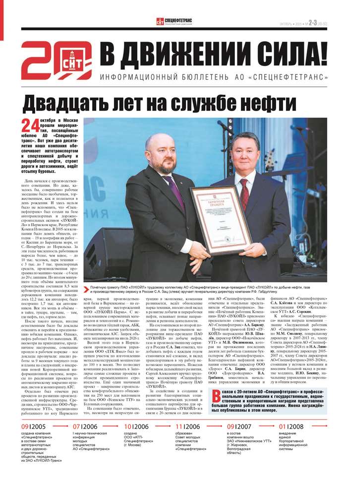 Информационный бюллетень «В движении сила!» - периодическое печатное издание группы компаний АО «Спецнефтетранс» выходит с 2013 г. На его страницах рассказывается о жизни компании и дочерних обществах, трудовых достижениях и лучших работниках.